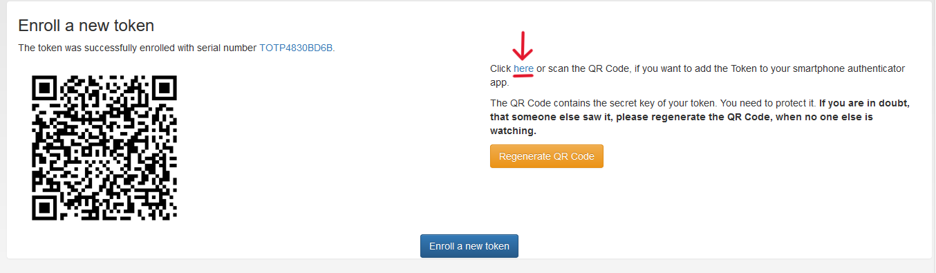 - If the roll-out process was carried out in the browser of the smartphone/tablet, which would have to scan the code, the link shown below can also be clicked at the word „here“. This allows the token to be transferred to Free OTP even without a QR code.